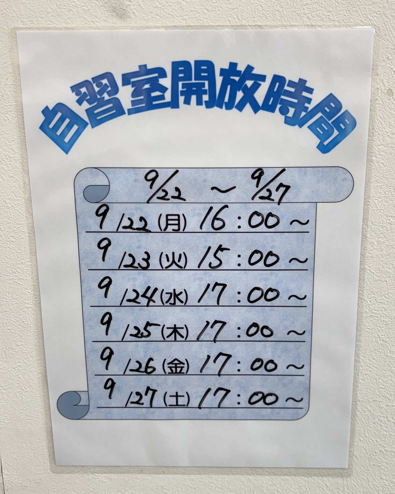 あと今週の校舎の自習開放時間をお伝えします!!