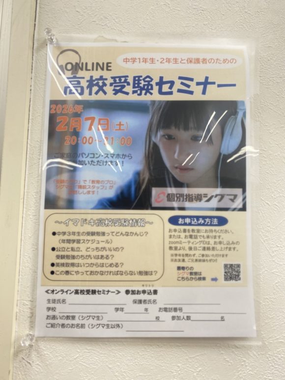 また2/7実施の中1生・中2生対象の高校受験セミナー(オンライン)のご案内も掲示しています!