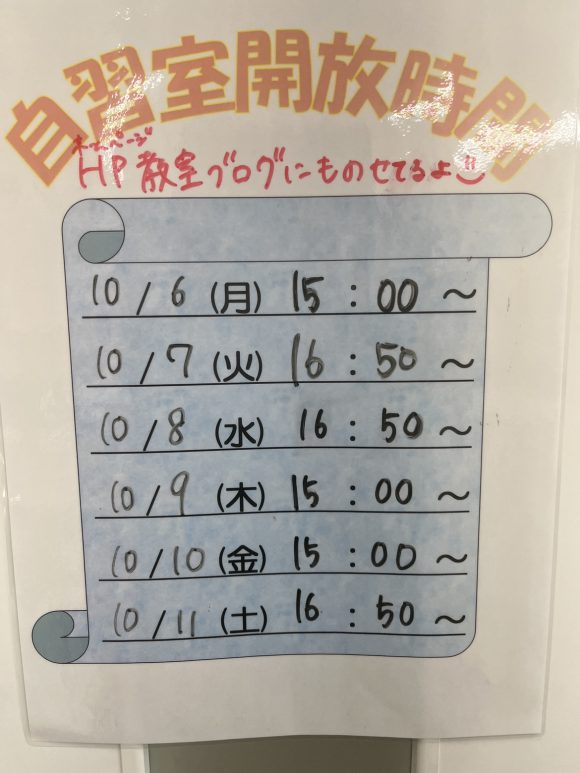 自習室利用の高い武庫之荘校の生徒さんに向けて、毎週土曜日に自習室開放時間をブログで更新を行っていきます!