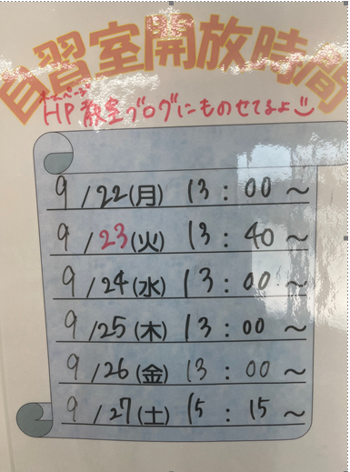 このブログでは今後、1週間の教室開校時間も情報をアップしていくようにいたしますので、