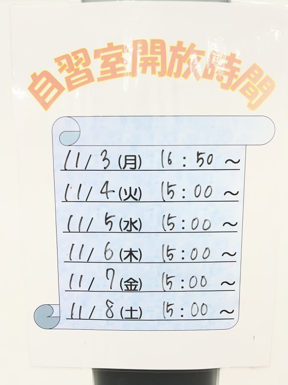 【10/27(月)~11/1(土) 自習室開放時間📢✨】