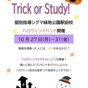 こんにちは! 豊中市寺内地域の学習塾 【個別指導シグマ 緑地公園駅前校】です🐻 10月はハロウィン🎃 ということで、ハロウィンイベントを開催します! 期間は10/27~31までの10月最終週です。 受講生が多い英語・…