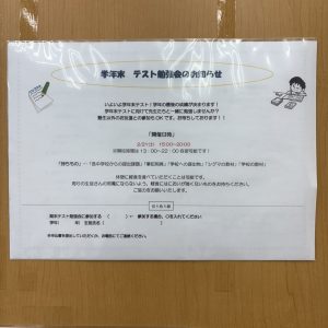 こんにちは! 豊中市寺内地域の学習塾 【個別指導シグマ 緑地公園駅前校】です🐻 来週、再来週と中1.2生は学年末テストになります。 そこで2/21(土)に「学年末 テスト勉強会」を開催します! ※来週がテストの生徒さんは14日…