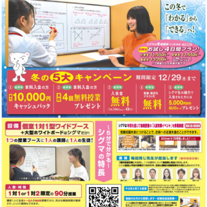 こんにちは! 個別指導シグマ、ブログ担当です。 私立高校入試まで1週間を切りました。 中学3年生は今、 志望校の過去問を解き、苦手分野を強化し・・・と、 受験にむかって最後の追い込みの真っ最中です。 保護者さまとも、ご連絡を密にし、 過去問…