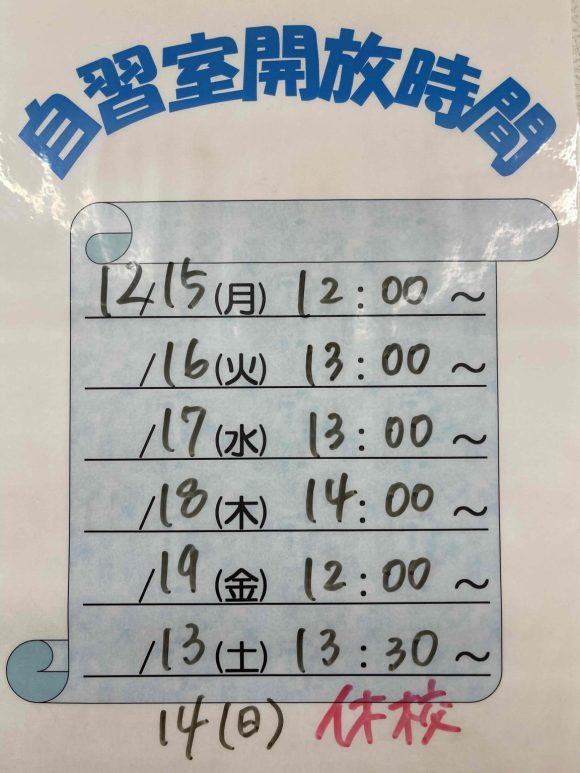 あすから1週間の自習室開放時間はこちら↓↓↓
