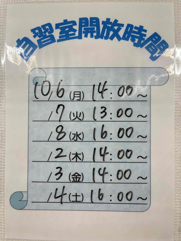 最後にあすから1週間の自習室開放時間はこちら↓↓↓